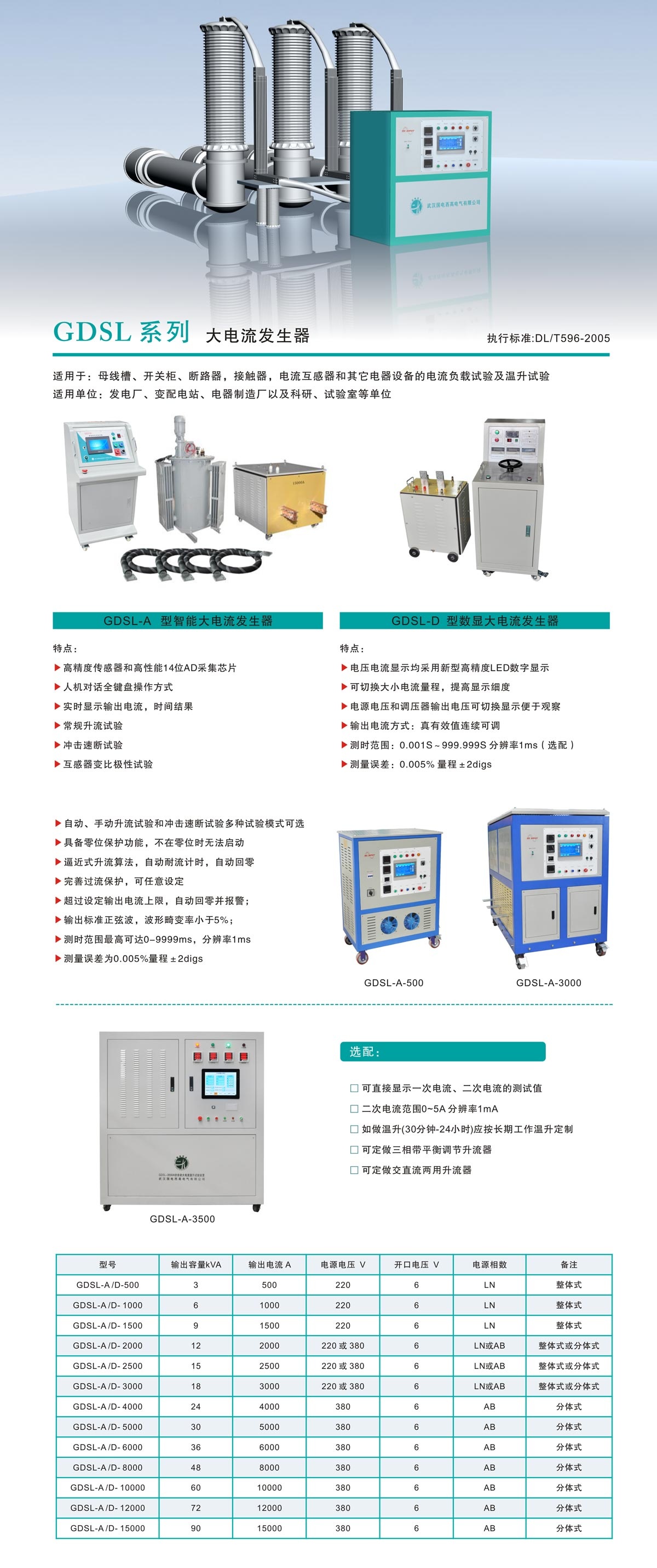 GDSL-A型 智能大電流發(fā)生器,我公司自行研制開發(fā)的測試設(shè)備,它集國內(nèi)外同類產(chǎn)品的優(yōu)點(diǎn)于一身,采用數(shù)控技術(shù),抗干擾能力強(qiáng),和上一代升流器相比,由于采用低功耗、大容量的自藕調(diào)壓器和高導(dǎo)磁率鐵芯制作的變流器,具有輸出功率大,體積小,重量輕等優(yōu)點(diǎn)。主要用于互感器變比極性,電動機(jī)保護(hù)器,空氣開關(guān),開關(guān)柜,斷路器,保護(hù)屏校驗(yàn)。它是電力、電氣行業(yè)在調(diào)試中需要大電流場所的必需設(shè)備,廣泛應(yīng)用于發(fā)電廠、變配電站、電器制造廠及科研院所等部門。