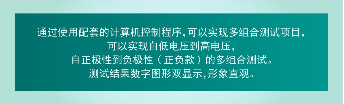 4.可通過計(jì)算機(jī)程控軟件,實(shí)現(xiàn)批量組合測試,如2KV3次、4KV3次、6KV3次、-2KV3次、-4KV3次、-6KV3次等,可實(shí)現(xiàn)最大50組組合測試,并向計(jì)算機(jī)反饋擊穿次數(shù)、擊穿電壓等測試結(jié)果,計(jì)算機(jī)以圖形顯示反饋結(jié)果,使判斷更直觀。