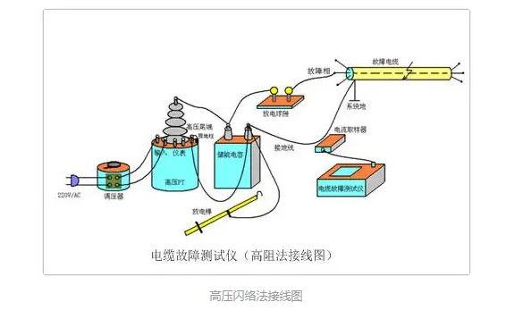 高壓閃絡法的用途正好是與跨步電壓法互補,是解決阻值大于200歐姆時的電纜故障,采用脈沖直流電壓在絕緣層最薄弱的環(huán)境產(chǎn)生放電現(xiàn)象,通過專用放大接收器接收并處理,測量過程相對比較復雜,下圖是高壓閃絡法的現(xiàn)場接線圖: