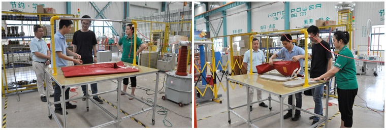 客戶抵達(dá)公司后,負(fù)責(zé)接待的同事了解客戶的考察需求隨后一同前往我司生產(chǎn)車間。在公司技術(shù)人員的介紹下重點(diǎn)研究學(xué)習(xí)了GDJS-6系列 絕緣手套(靴)耐壓試驗裝置的操作流程、接線方法以及注意事項等理論知識,并用這套耐壓試驗裝置配合GDD系列絕緣墊(毯)試驗電極裝置一起做了實踐演示,讓客戶更清楚掌握試驗設(shè)備的使用方法、工藝流程等相關(guān)知識。