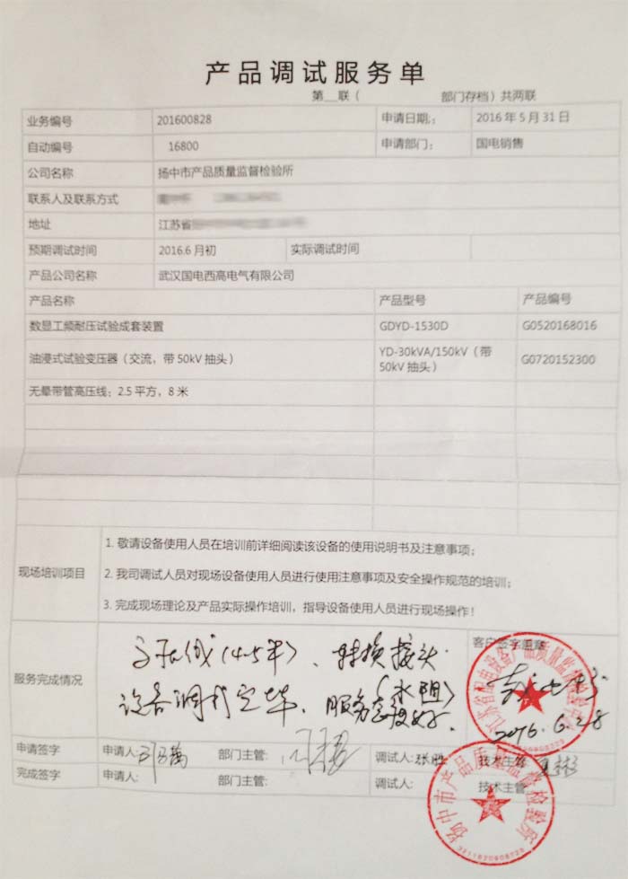 六月,我公司技術(shù)部接到江蘇揚(yáng)中質(zhì)檢所的調(diào)試邀請。在6月27日安排兩名技術(shù)工程師前往江蘇為客戶進(jìn)行調(diào)試服務(wù),此行為客戶調(diào)試的只要產(chǎn)品為GDYD-1530D數(shù)顯工頻耐壓試驗(yàn)成套裝置。
