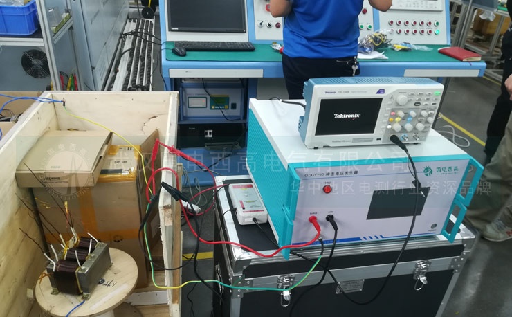調(diào)試當(dāng)天,我司技術(shù)人員將設(shè)備安裝好之后,按客戶(hù)要求準(zhǔn)備做變壓器沖擊電壓試驗(yàn)?,F(xiàn)場(chǎng)在客戶(hù)的組織下首先開(kāi)始培訓(xùn)設(shè)備接線(xiàn)方法,從設(shè)備接地接線(xiàn)方法到最后連接被試品一個(gè)步驟不落的教授給客戶(hù)。接著進(jìn)入實(shí)際操作演示。
